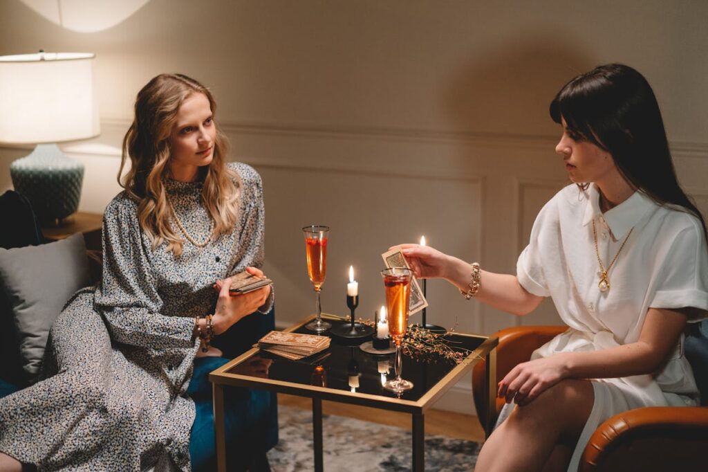 Jeśli zdecydujesz się na indywidualną sesję wróżb, najpierw musisz umówić się na spotkanie dokonując rezerwacji telefonicznej. Gdy dotrzesz do saloniku wróżb, od razu po przekroczeniu jego progu poczujesz wyjątkową atmosferę tego miejsca. To przytulne miejsce pełne świec, zapachów kadzideł i pięknych kart tarota rozłożonych na stole.